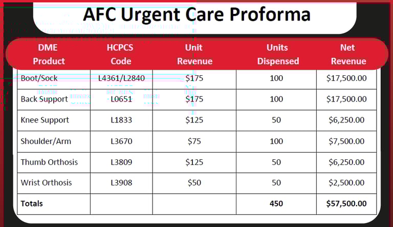 Proforma is based on an urgent care center with 10,000 annual visits, where 5% involve a DME-related indication and an orthopedic product dispensed.